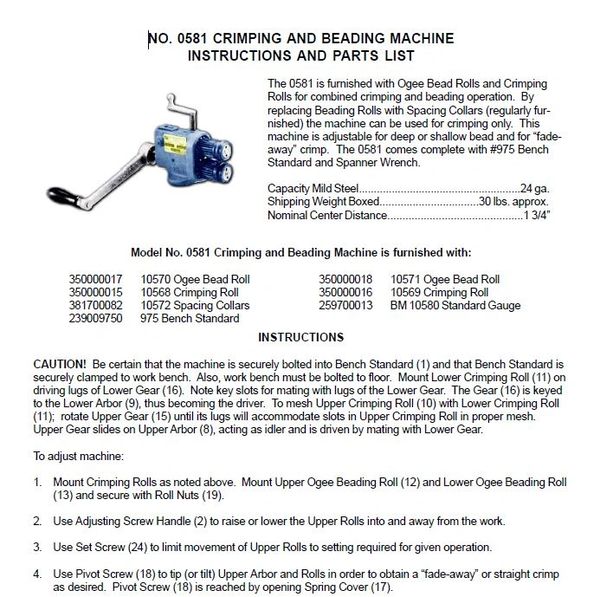 Pexto No 0581 Crimping Beading Instructions And Parts List