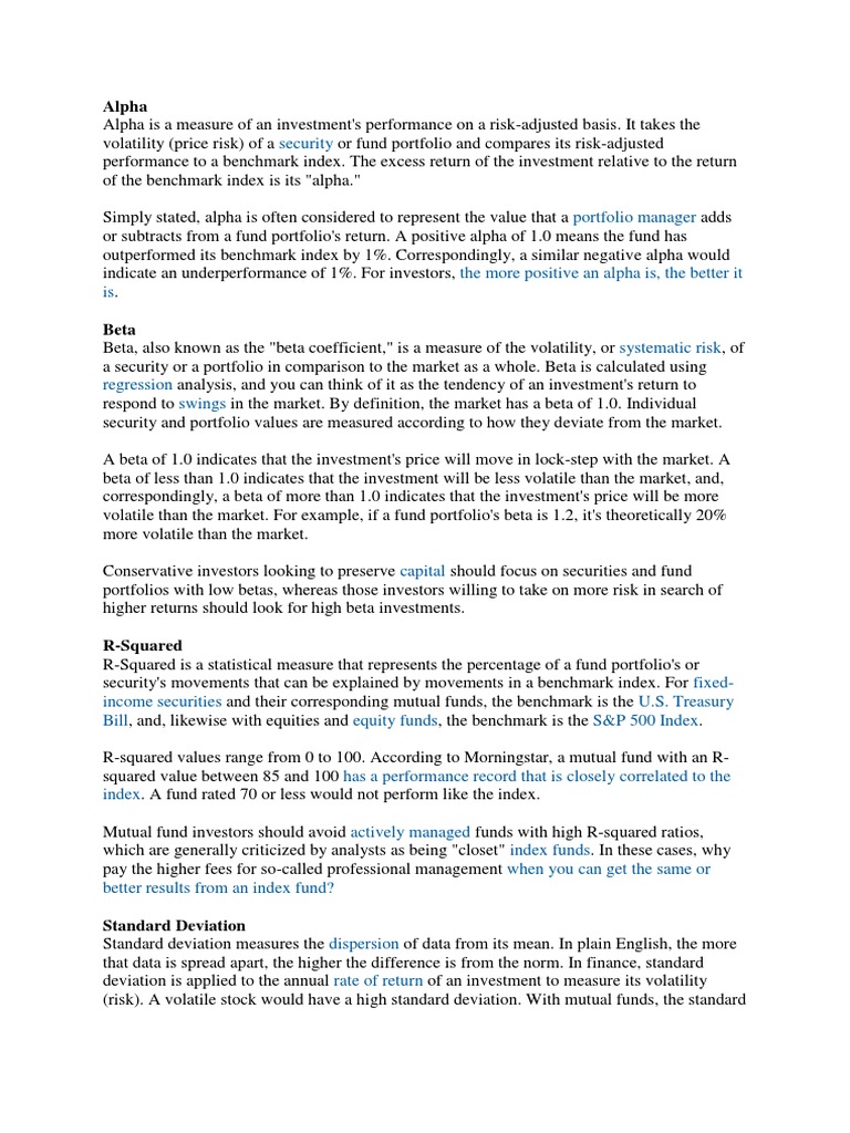 Mutual Fund Index Beta Finance Sharpe Ratio