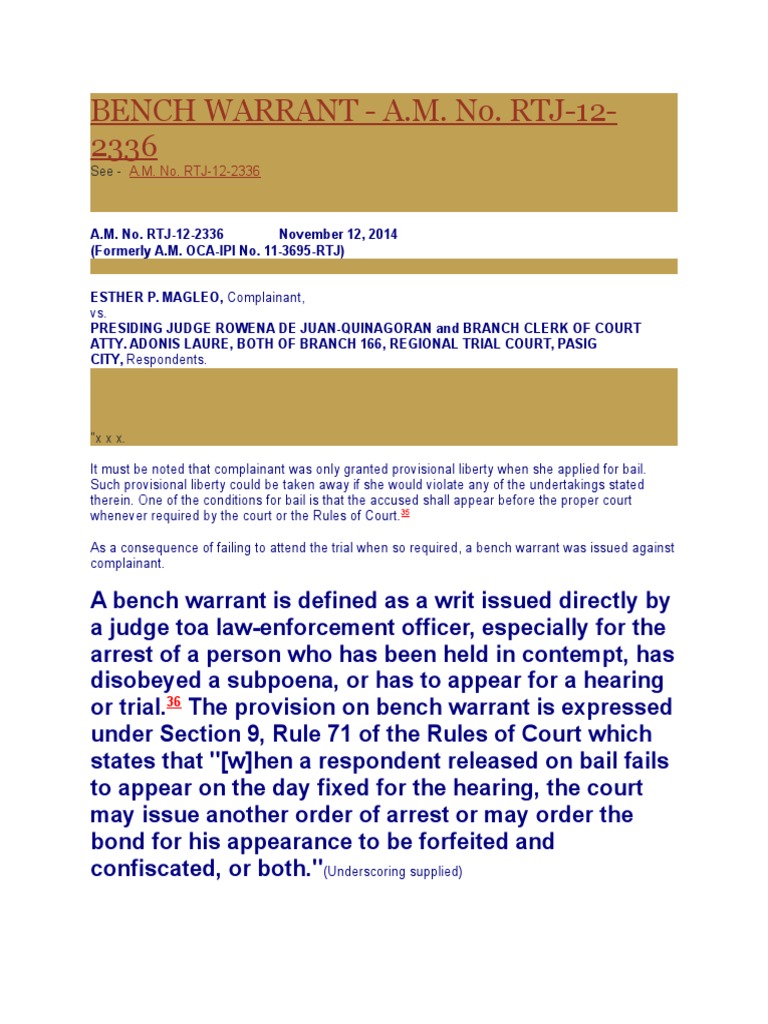 Bench warrants are normally only issued by a judge if you are being charged with a misdemeanor. A bench warrant is typically issued in the case of a failure to appear for trial or fta bench warrant vs. Miscellaneous warrants rule 150.